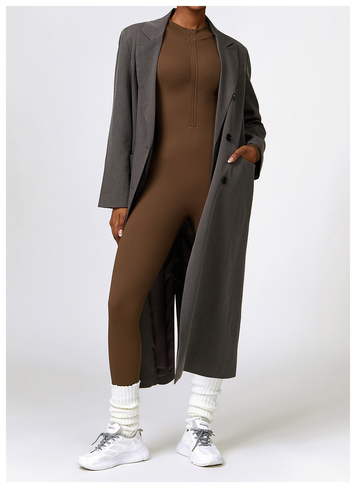 This jumpsuit is made from delicate ribbed fabric, which is smooth and soft, giving a silky touch to the skin and providing a gentle tightening sensation. The half zipper, when opened, subtly outlines the curve of the neck, exuding a unique sensuality and allowing easy wearing and removal. The small stand-up collar not only adds depth to the design but also provides warm protection for the neck. The shorts design ensures both ease of movement and showcases slender legs, radiating youthful energy.