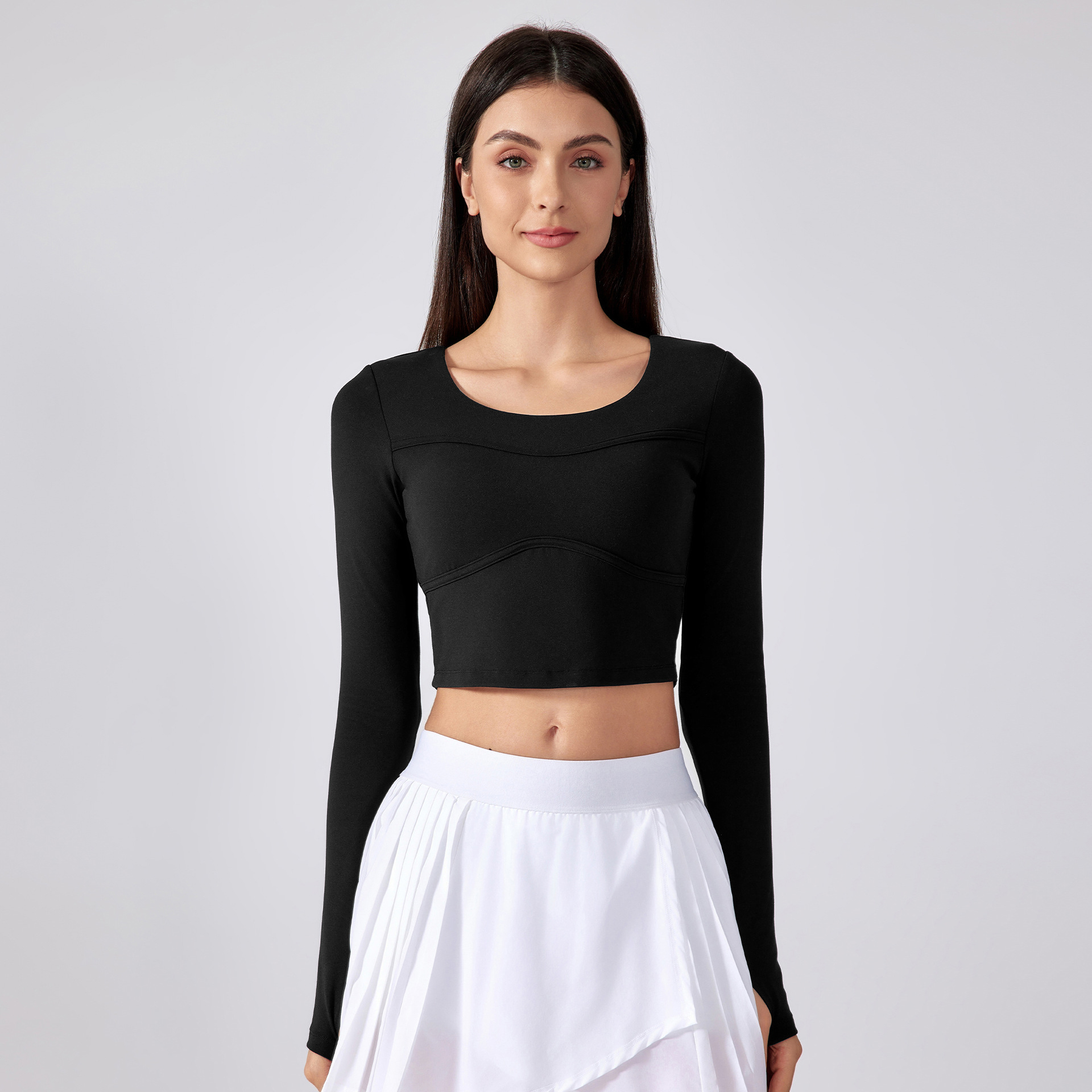 The semi-fixed cup pads offer support without the need for an additional bra, ensuring comfort and functionality, making it perfect for morning runs, yoga, and various other activities. The 3D cut fits the body shape, and the cropped, waist-length design allows for unrestricted movement, while the thumb holes in the long sleeves add a sporty touch and keep the sleeves in place during exercise. Made from high-quality nylon (79%) and spandex (21%), the fabric is soft, breathable, and offers excellent elasticity, providing superior comfort for intense workouts. Available in sizes S to XXL, this yoga top caters to a wide range of body types and personal preferences. Whether for daily training or high-intensity activities, it provides lasting comfort and support, allowing every woman to feel confident and empowered during their workouts.